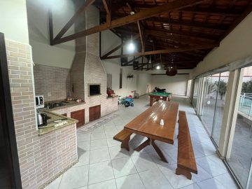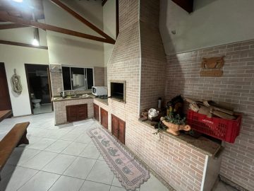 Salão com churrasqueira e fogão a lenha